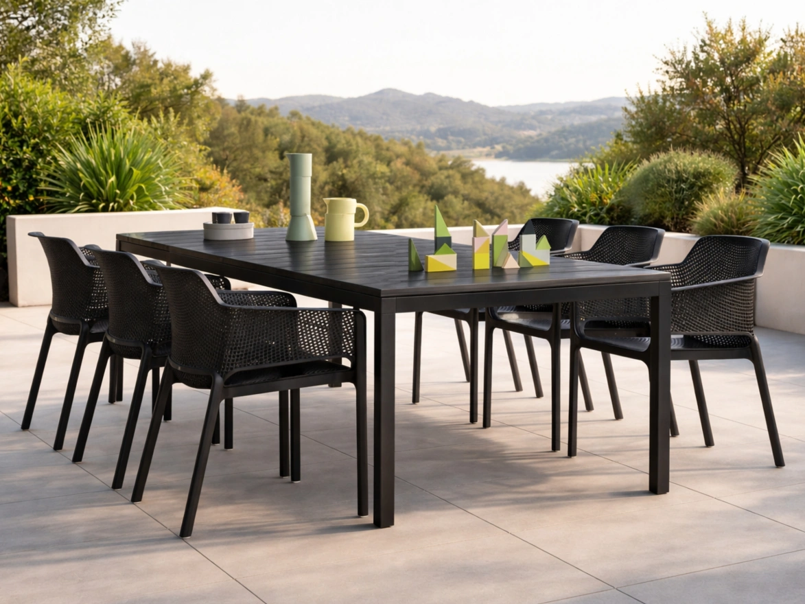 The RIO/NET 1+6 garden set includes a rectangle RIO table and NET chairs - italian design!