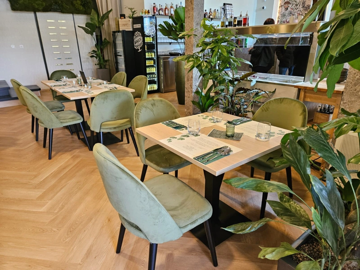 Posebna pažnja posvećena je odabiru materijala koji osiguravaju trajnost i estetiku pri svakodnevnom korištenju. Po narudžbi izrađene ploče stolova i pažljivo odabrane stolice upotpunjuju arhitektonsku cjelinu i stvaraju ugodan ambijent za goste.
