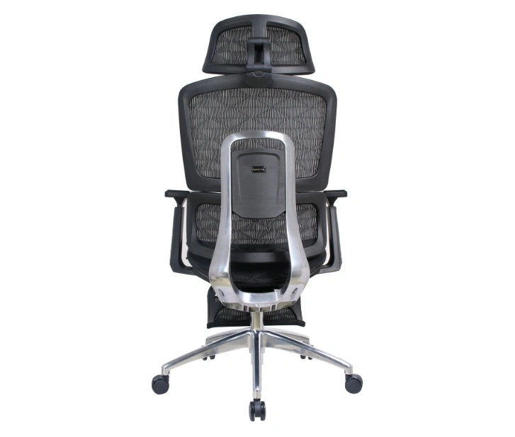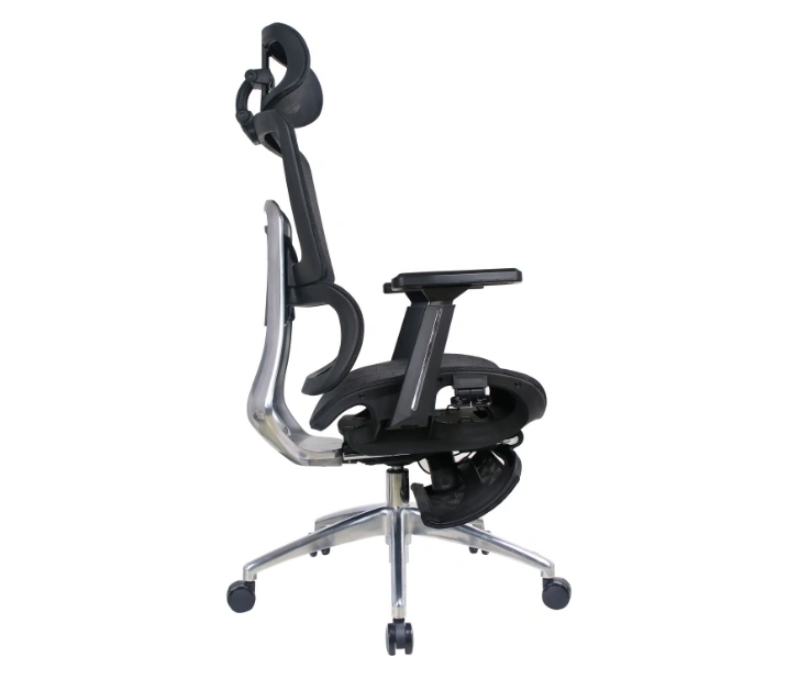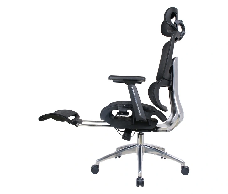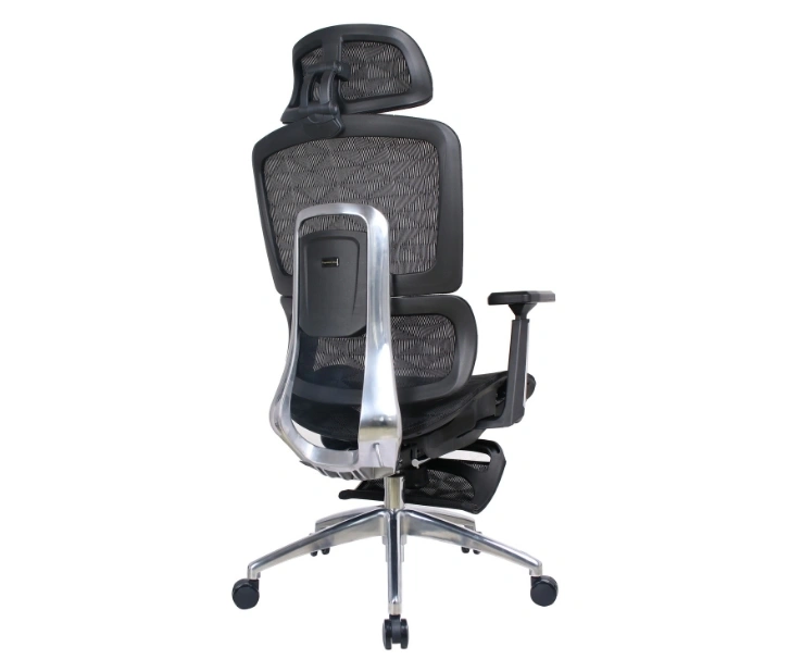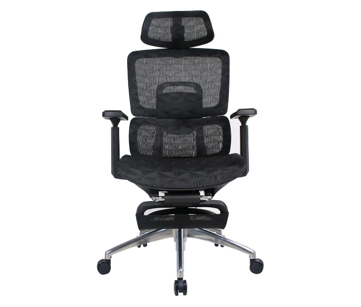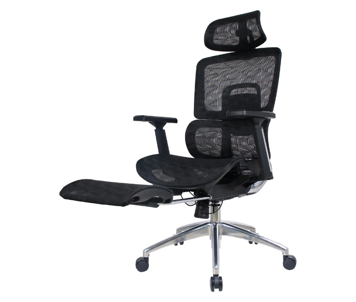 Mrežasto naslonjalo omogoča stalno kroženje zraka in preprečuje pregrevanje, medtem ko integrirana ledvena opora zagotavlja pravilno podporo hrbtenici. Stol je opremljen z nastavljivim vzglavnikom za dodatno oporo vratu, zložljiva opora za noge pa omogoča sprostitev med odmori ali pri daljšem delu.