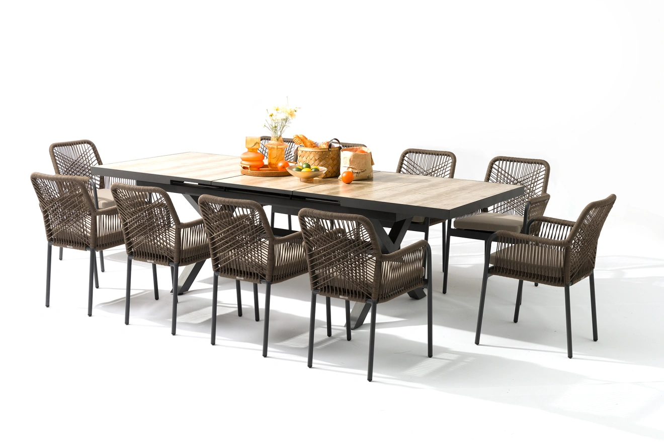 Jedilna miza Adeline je elegantna raztegljiva miza iz visokokakovostnih keramičnih plošč, odporna na praske, vročino in enostavna za čiščenje. Njen okvir iz aluminijastih cevi v antracitni barvi in samodejni raztegljivi mehanizem omogočata udobno uporabo za večje skupine. Stol Alicante je odličen za profesionalno in domačo uporabo, saj kljub robustnosti pletenje iz trpežnih tekstilenskih vrvi daje modern videz. Stol je na voljo v antracitni barvi in je nakladalen za enostavno shranjevanje.