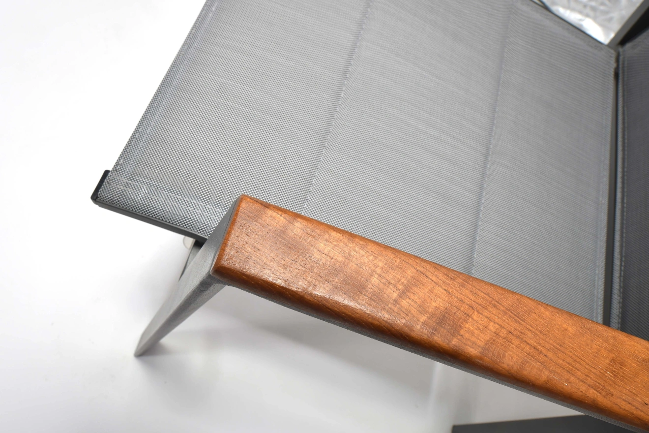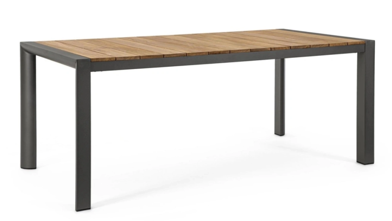 Material mize: podnožje iz aluminija, plošča iz tikovega lesa.