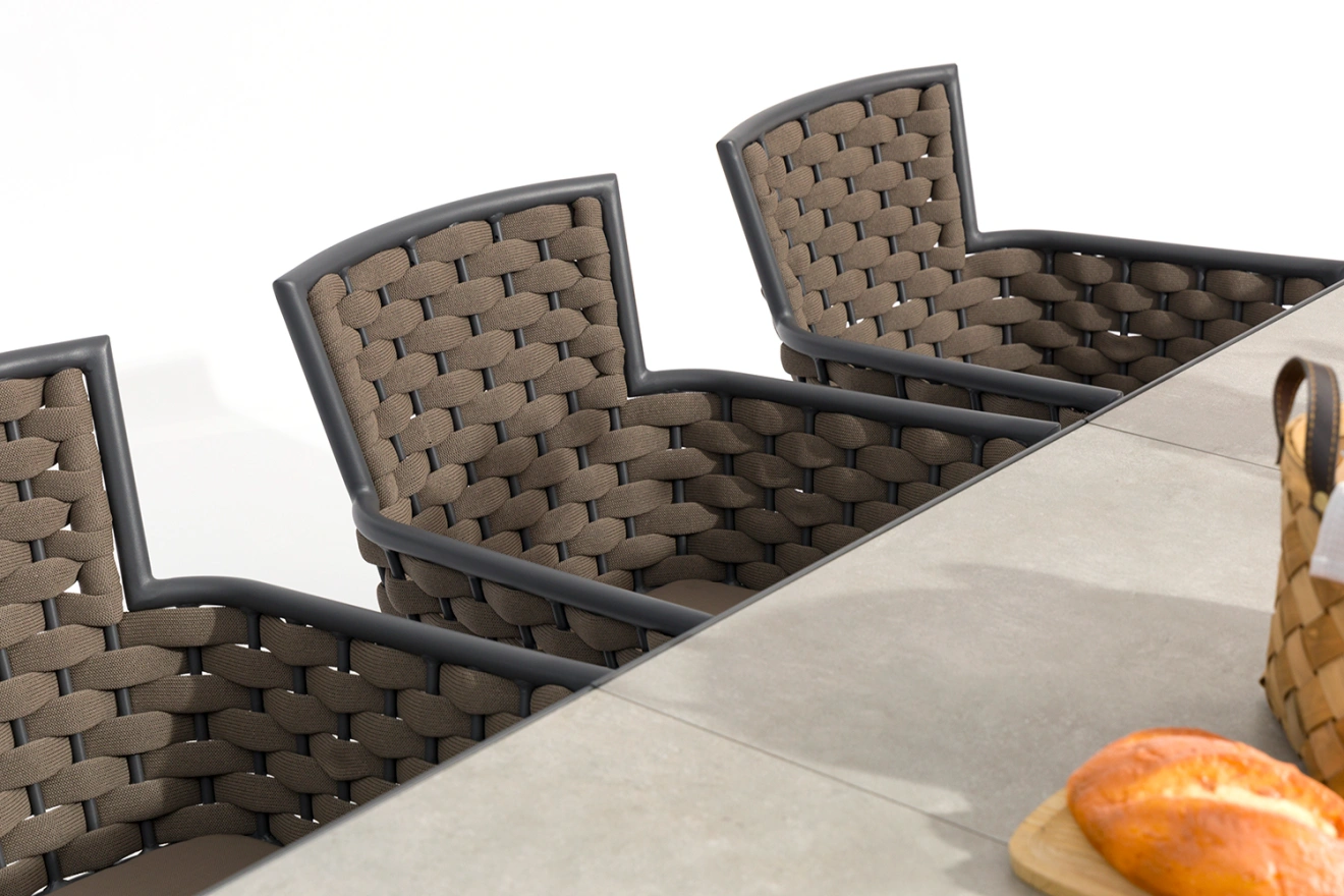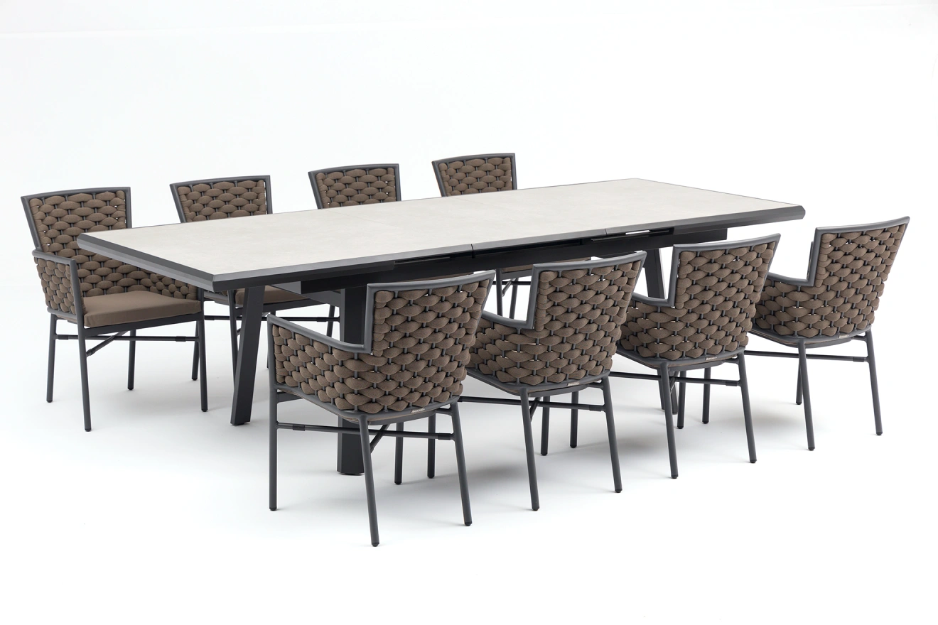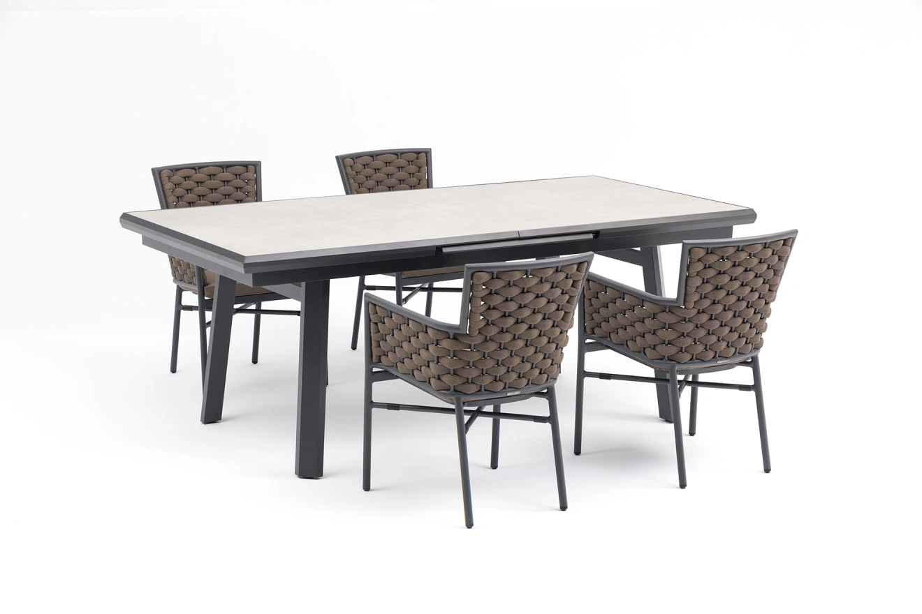 Garnitura Zara ponuja sodoben dizajn in izjemno funkcionalnost. Miza s keramično ploščo v elegantni sivi barvi ter stabilno aluminijasto ogrodje zagotavljata dolgotrajno lepoto in trpežnost. Stol MEXICO z aluminijastim ogrodjem, mehkimi materiali in zaščito pred UV-žarki je popoln za zunanjo uporabo.