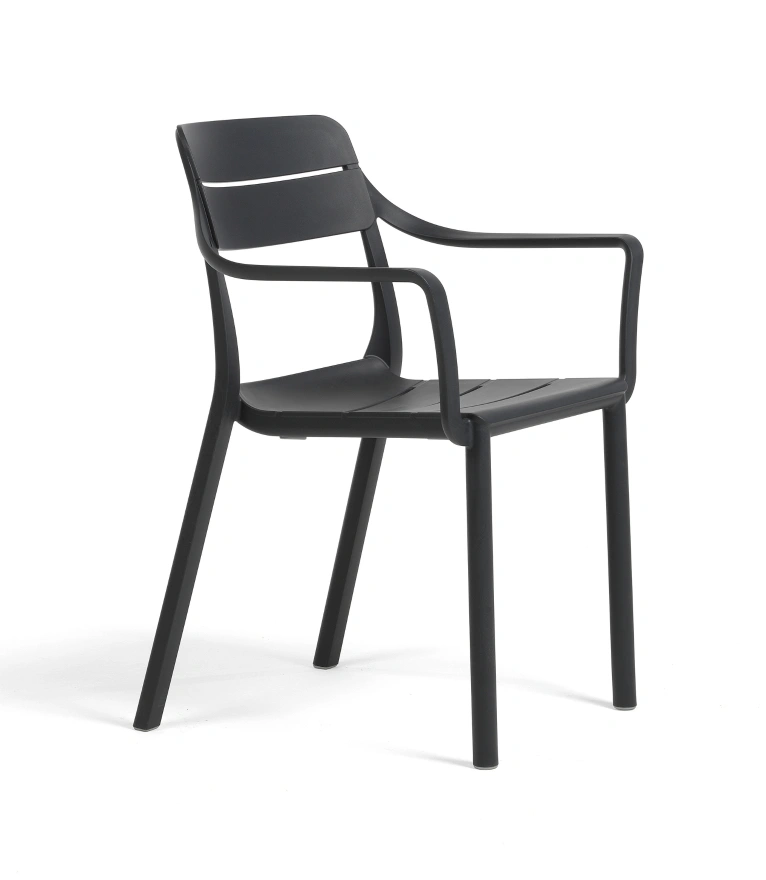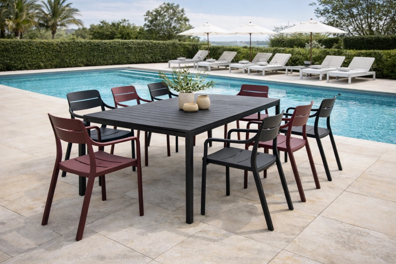 Ustvarite eleganten ambient za kosila, večerje in druženje na prostem z jedilno garnituro Tevere & Cassia R. Raztegljiva miza v modernem antracitu omogoča prilagoditev glede na število gostov, udobni stoli z rokonasloni pa poskrbijo za sproščeno sedenje. Materiali so odporni na UV-žarke, zato garnitura ohranja videz tudi pri redni zunanji uporabi.